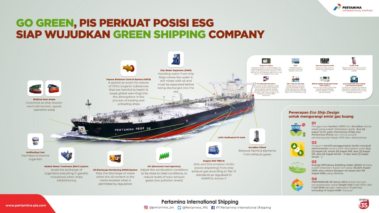 Pertamina International Shipping (PIS), Subholding Integrated Marine Logistics (SH IML). Berupaya memperkuat posisi dalam penerapan Environmental, Social dan Governance (ESG), yang tengah menjadi perhatian global termasuk Indonesia seiring dengan terjadinya perubahan iklim di dunia. Sejalan dengan ekpansi bisnisnya, PIS turut mendukung penerapan ESG dengan menghadirkan beberapa teknologi kapal yang ramah lingkungan (Green Shipping)… Read More